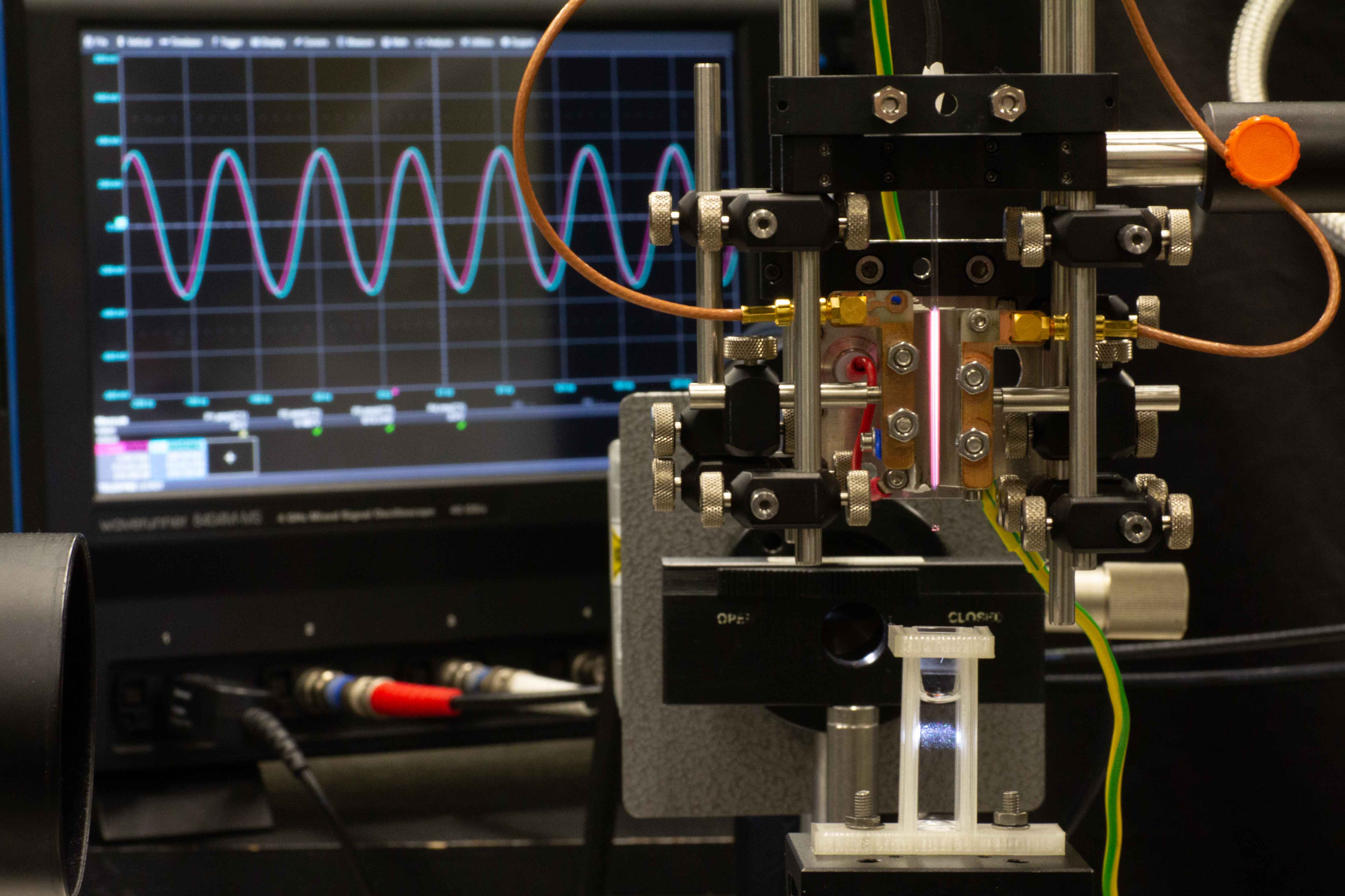 To achieve these measurement results, a complicated setup is necessary, which Katharina Grosse spent roughly a year on developing: “The electromagnetic interference is very strong and affects all measurement electronics. We had to build a large metal cage around the plasma chamber to bypass this source of interference. Another difficulty was to ensure the simultaneity of spectroscopic measurement and camera recording.”